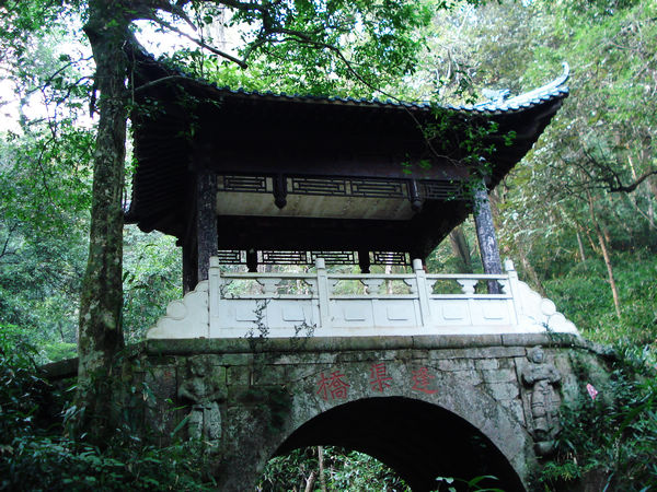 【百步岸】两旁都是原始森林,这些树木都属保护性树种,棵棵长成参天大树,树干粗壮,有的要几人合抱,树冠茂密,浓荫如盖。还有千年古藤,像一条条巨蟒,有的悬挂林间,有的缠绕大树。它们相互交织,那么亲密,到底是藤缠树,还是树缠藤呢?它们的关系就像洞山与禅林,禅宗靠洞山而立足、光大,洞山因禅宗而闻名、增值,都是身名相依、命运相连,相互攀附。