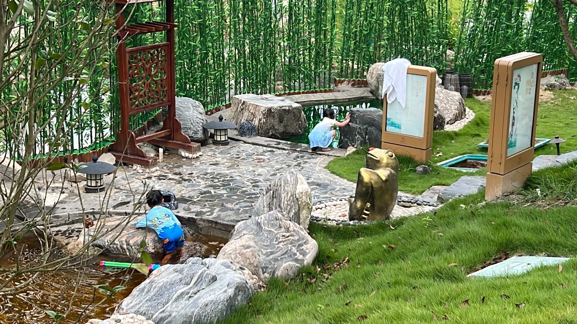 酒店有两个泳池,一个在温泉里面。一个在荷花池附近的泳池。温泉里的这个泳池有无边泳池和小型的儿童乐园。小朋友玩的很开心。温泉也很有特色,户外的泡池最特色的是船池。